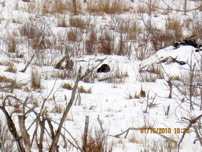 Three years ago I got a video of otters coming out of a hole through a muskrat lodge out on White Swamp. They were out in the fresh air for no more than ten minutes, nuzzling the snow, scating, but not venturing far from the hole. I walked up to the dam, and there was still a little opening into the pond but no sign that any otters used it.