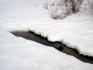 The water looks plenty deep now but the thawing has been slow and a week ago the beavers were probably scraping the bottom if they swam completely under water. I am still not sure where the beavers are staying. Last summer they seemed to shift among three different burrows along the east shore. The one in the middle, where the bank is highest, seems to be the only generating enough heat to keep the snow about it melting.